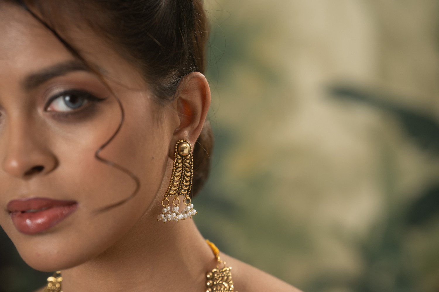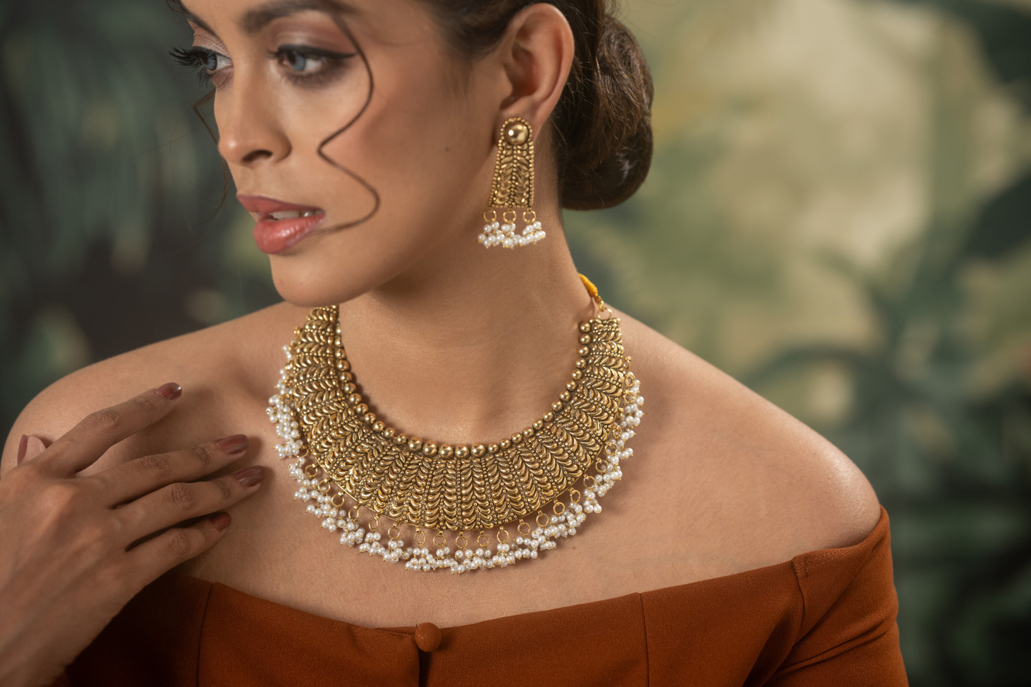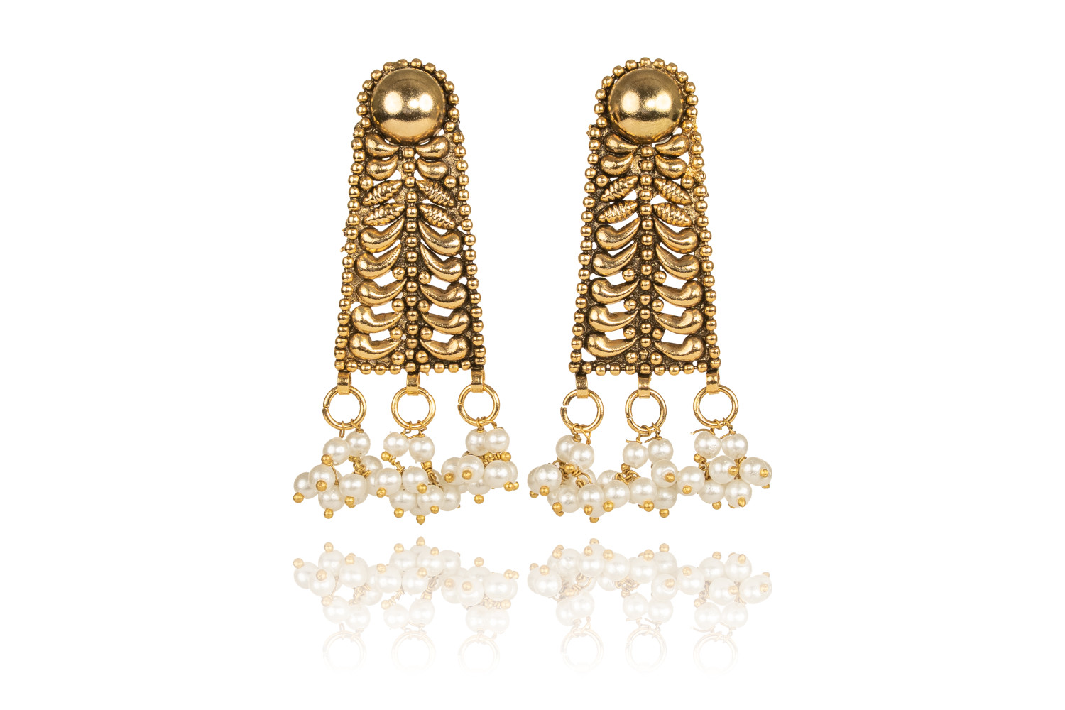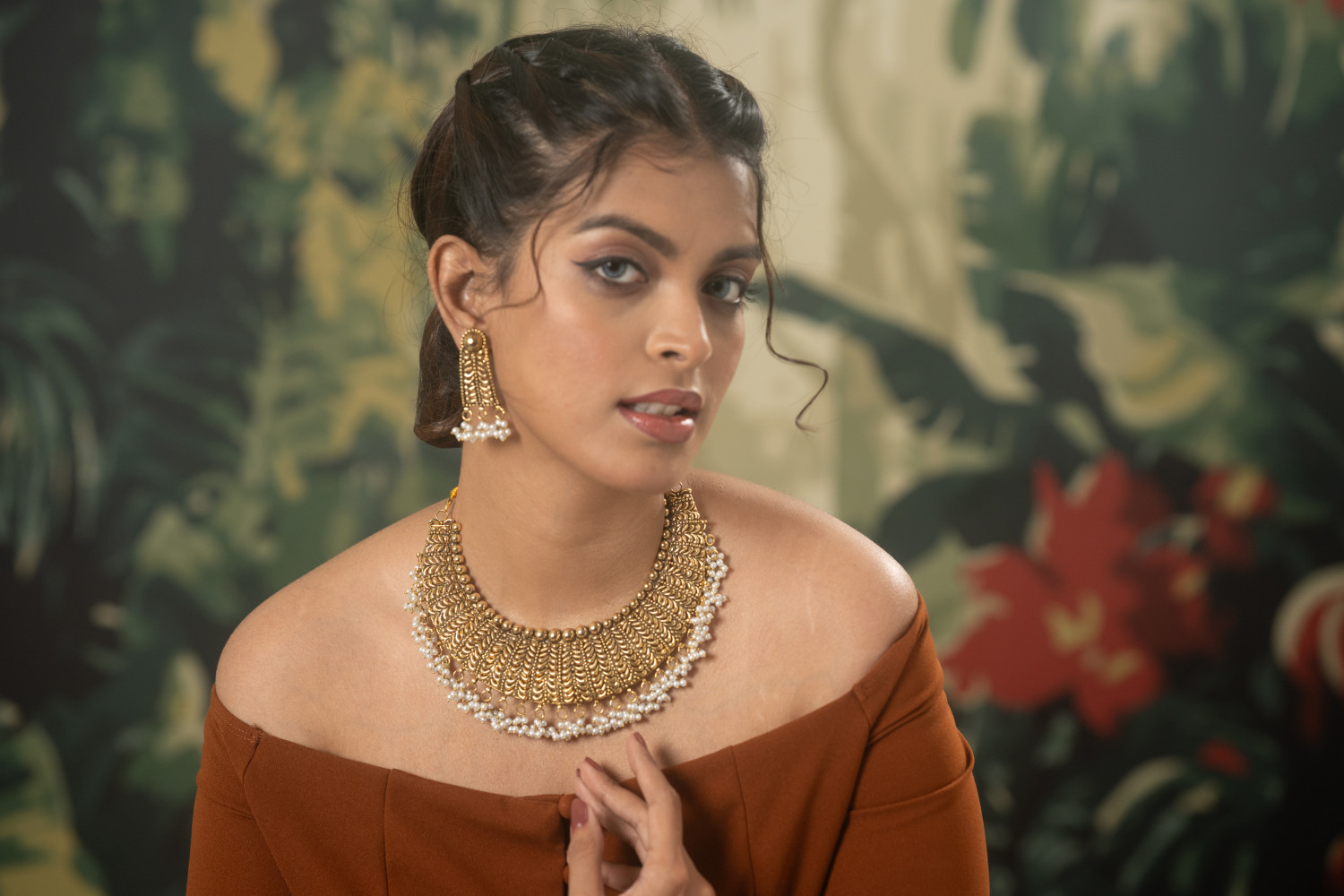 Brass made jewelry, with a coating of 21k gold on top. And beautifully detailed with synthetic pearl