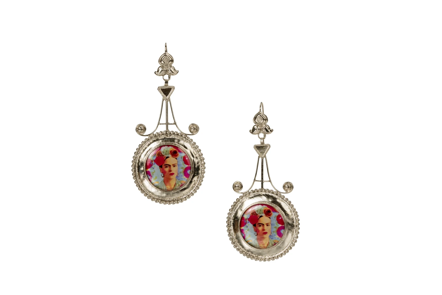 This earring was made as a symbol of love  for  Frida Kahlo. Brass made silver platted with chemical work on the middle.
