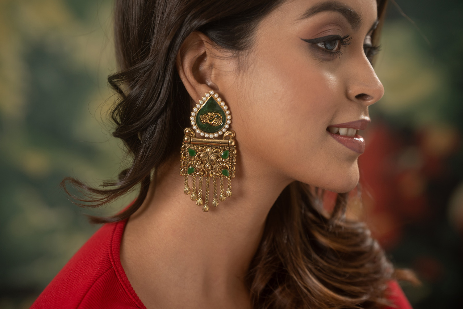 Hand crafted brass made jewelry with a coating of 21k gold. Green resin work on top to make it a little more extra touch!